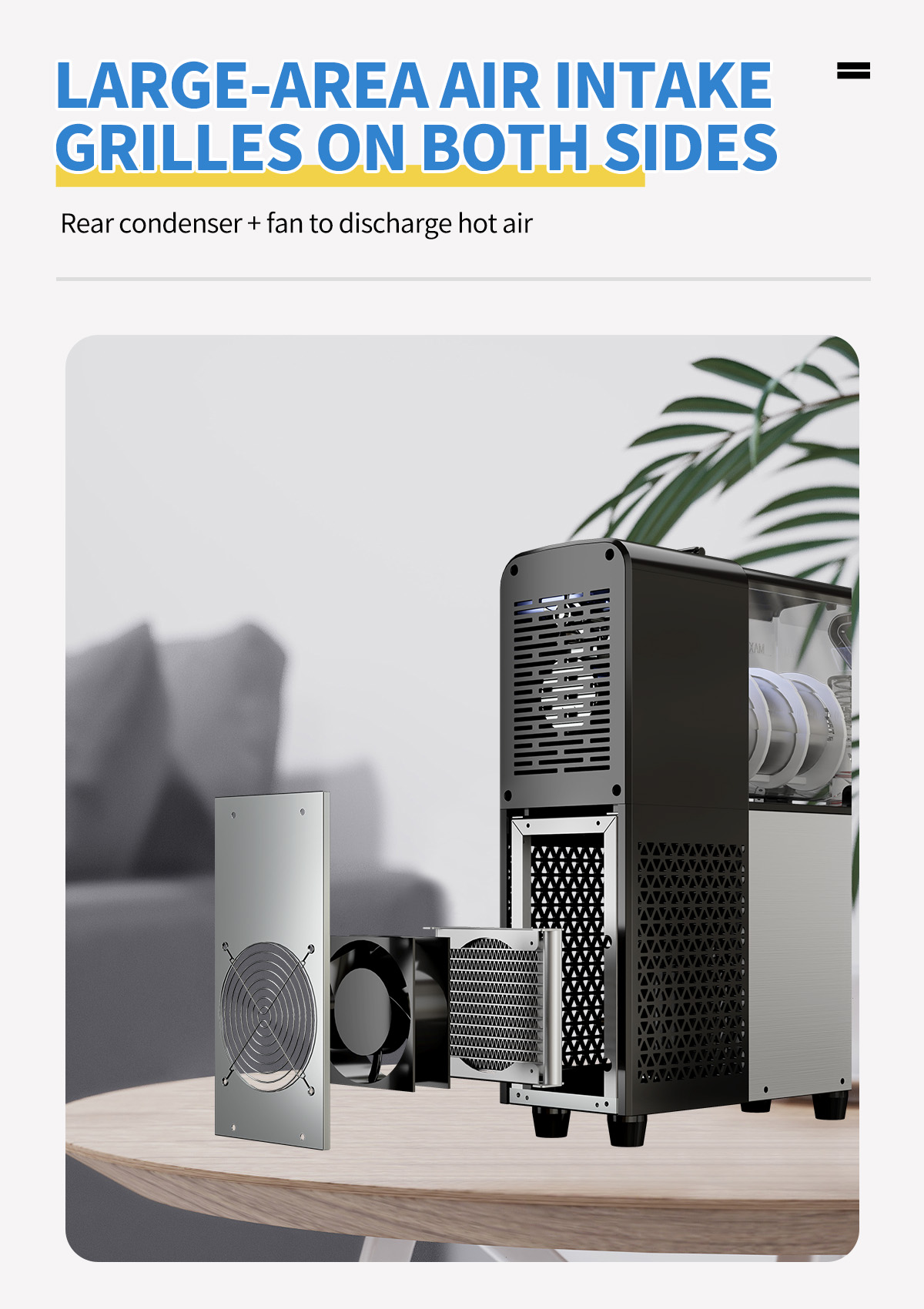 Rear condenser+fan to discharge hot air.