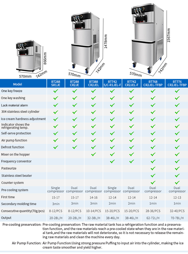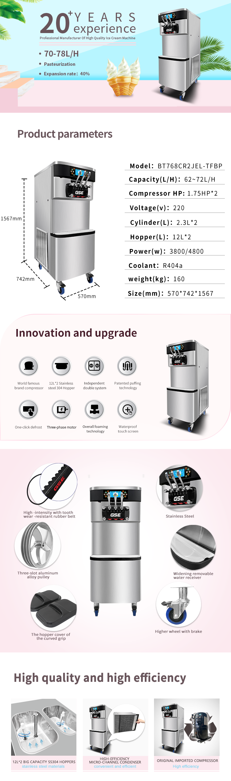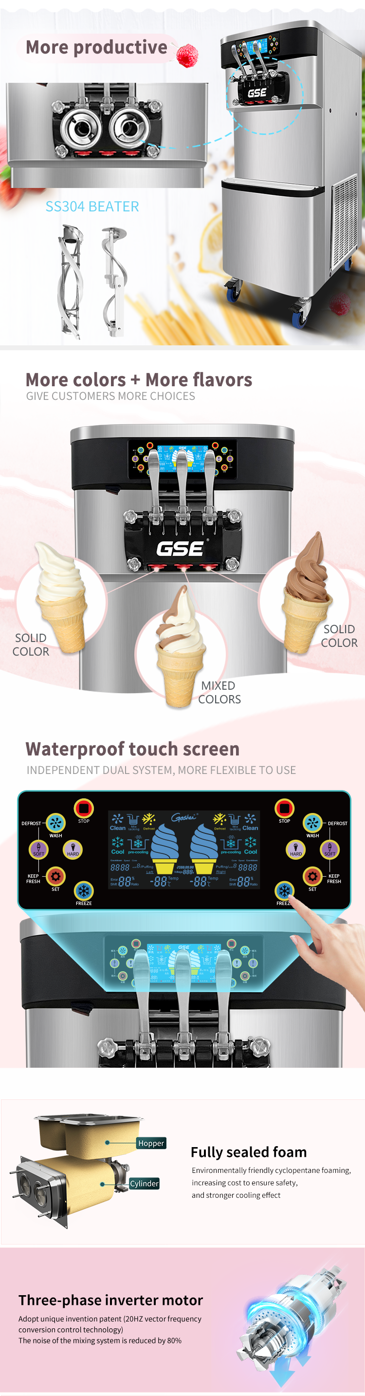 1. 7 days free cleaning ice cream machine 2. High Pressure Puffing Pump(40%~45%) 3. Three Phase with Frequency motos4. Waterproof Touch Screen